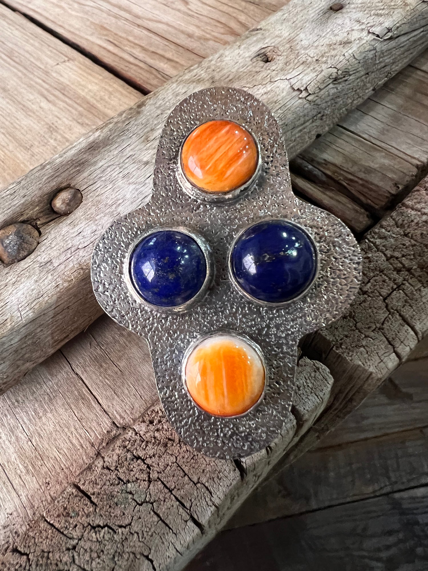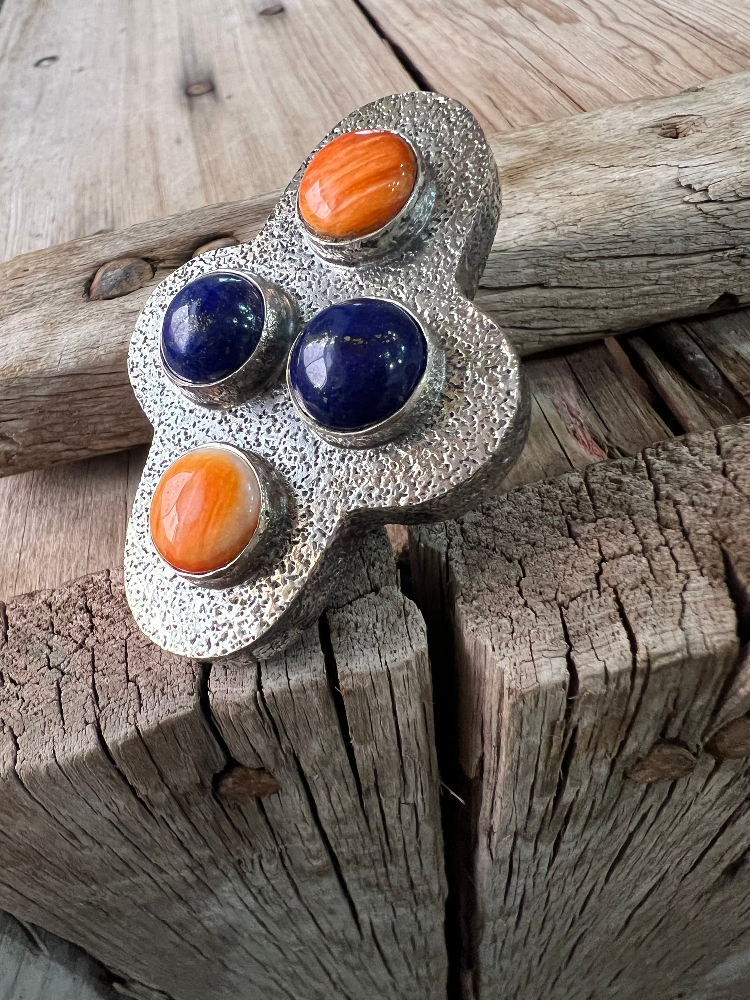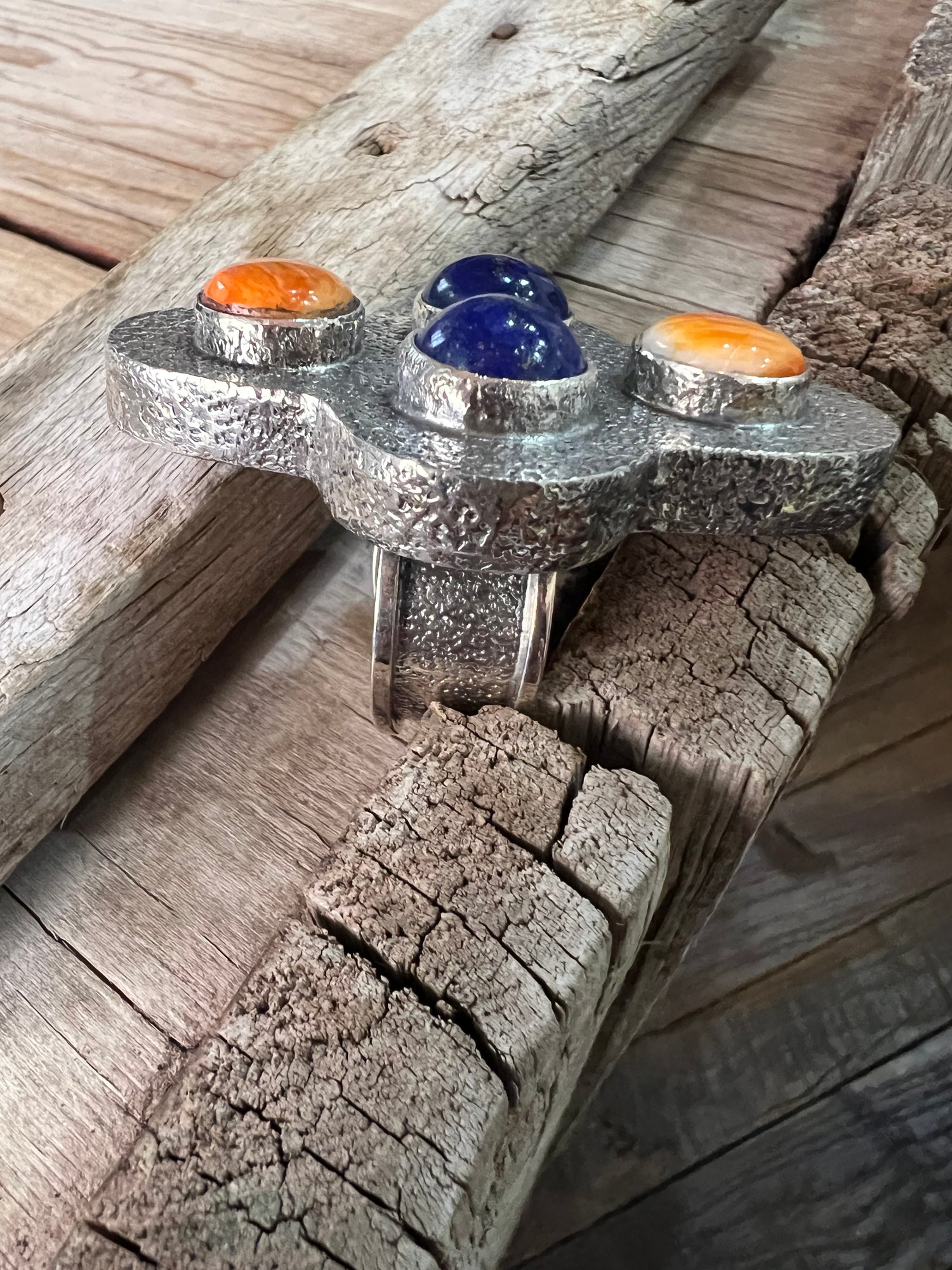 This refined sterling silver ring showcases the striking contrast of warm coral and deep lapis lazuli in a thoughtfully composed geometric arrangement. The Geometric Wonder combines contemporary design sensibilities with natural stone beauty, creating a piece that feels both modern and timeless. An adjustable band accommodates various sizes while maintaining the integrity of the design. Perfect for those who appreciate distinctive jewelry that balances artistic expression with wearable sophistication, this ring elevates any ensemble with understated glamour and visual intrigue.