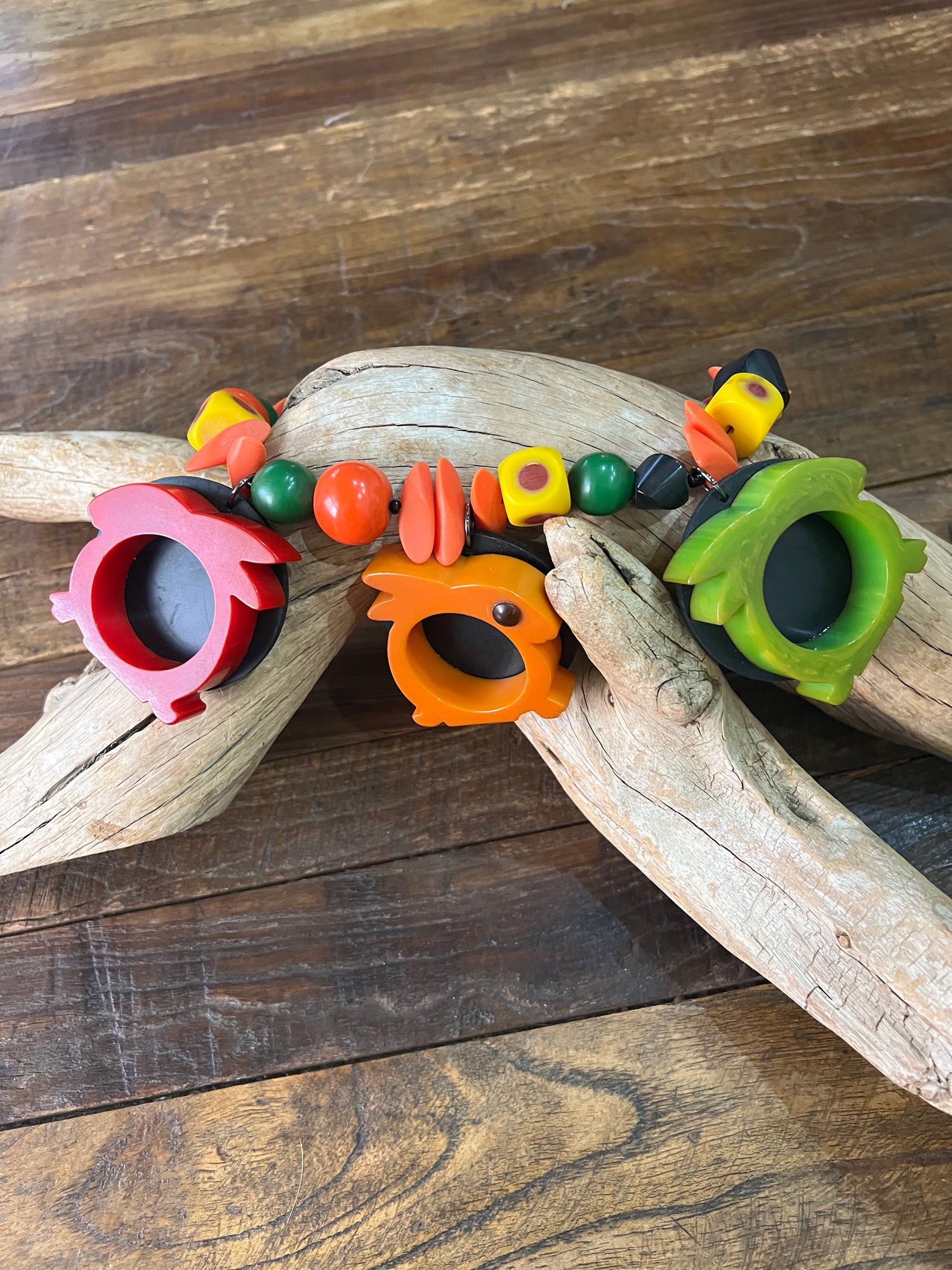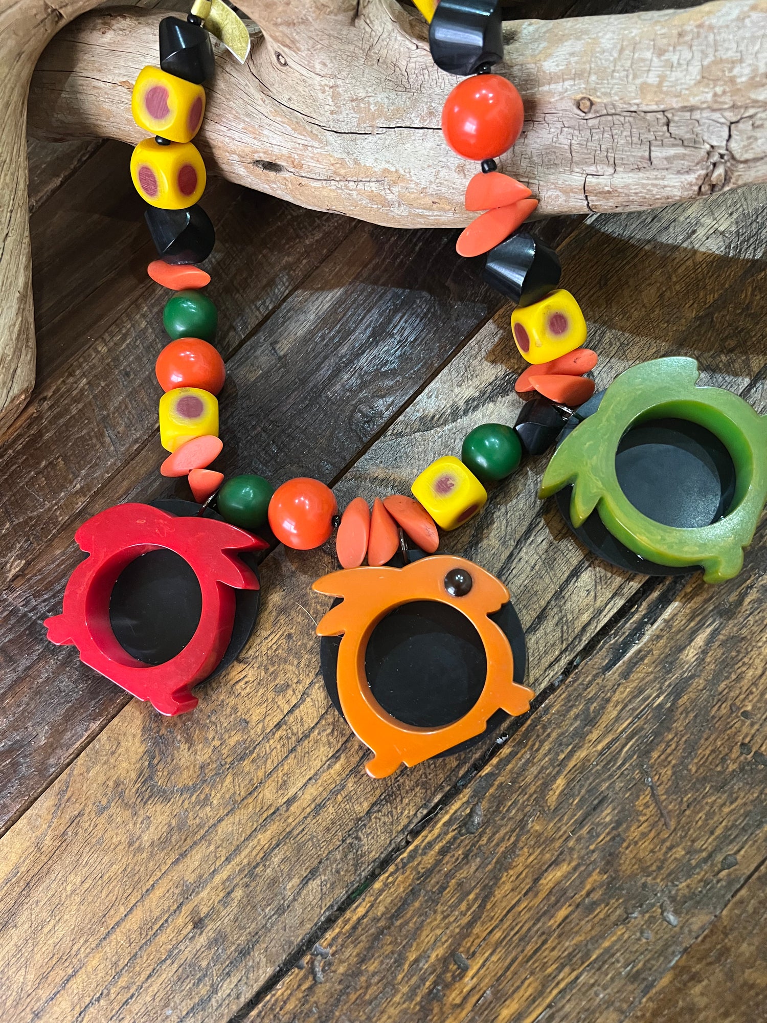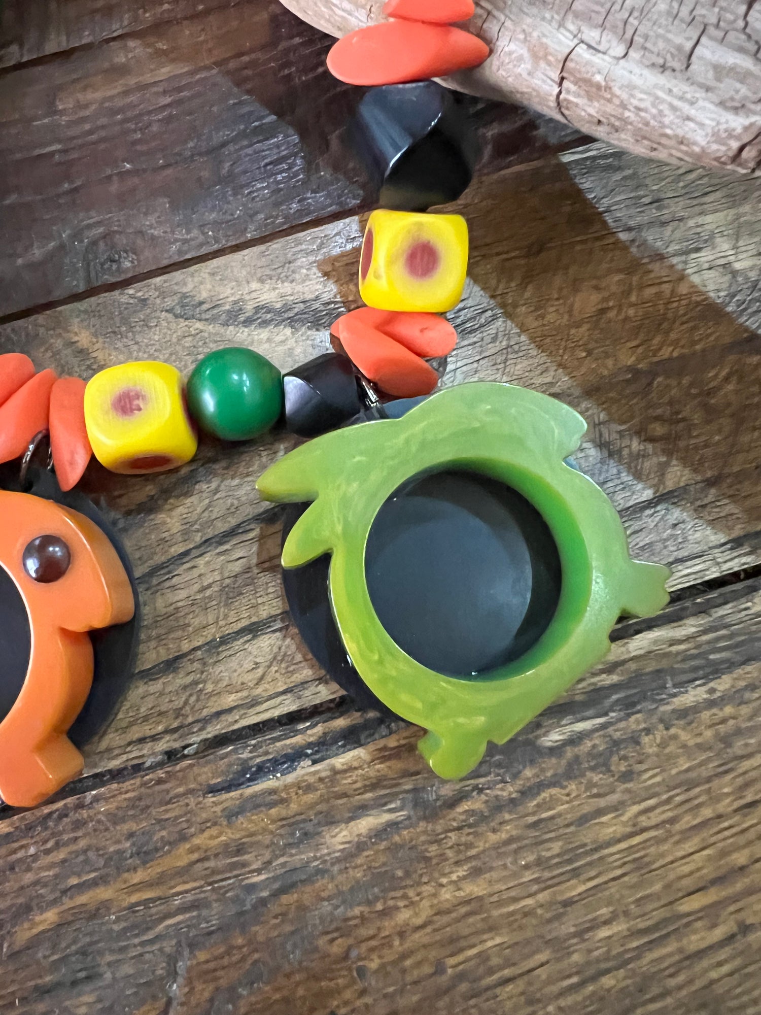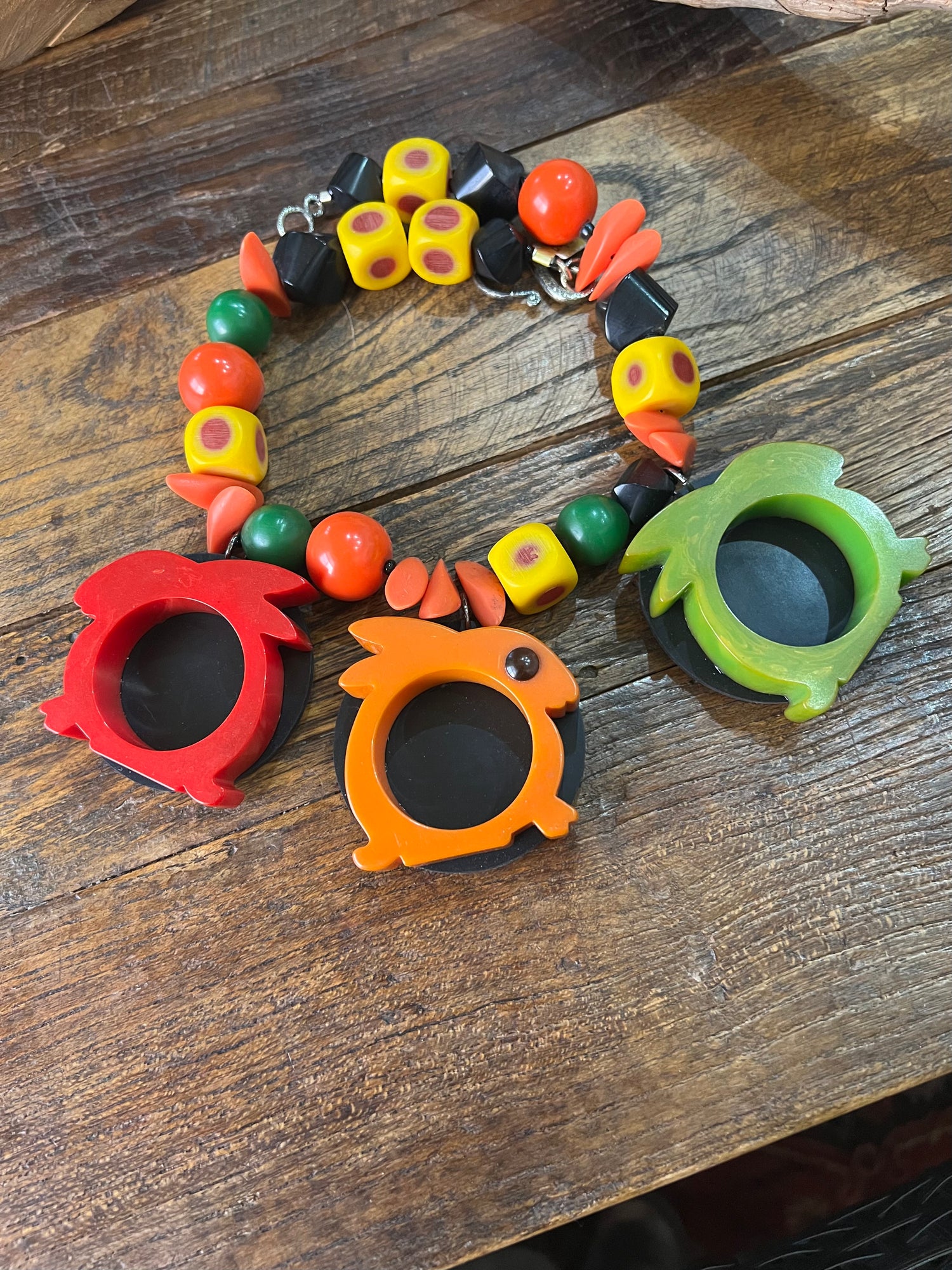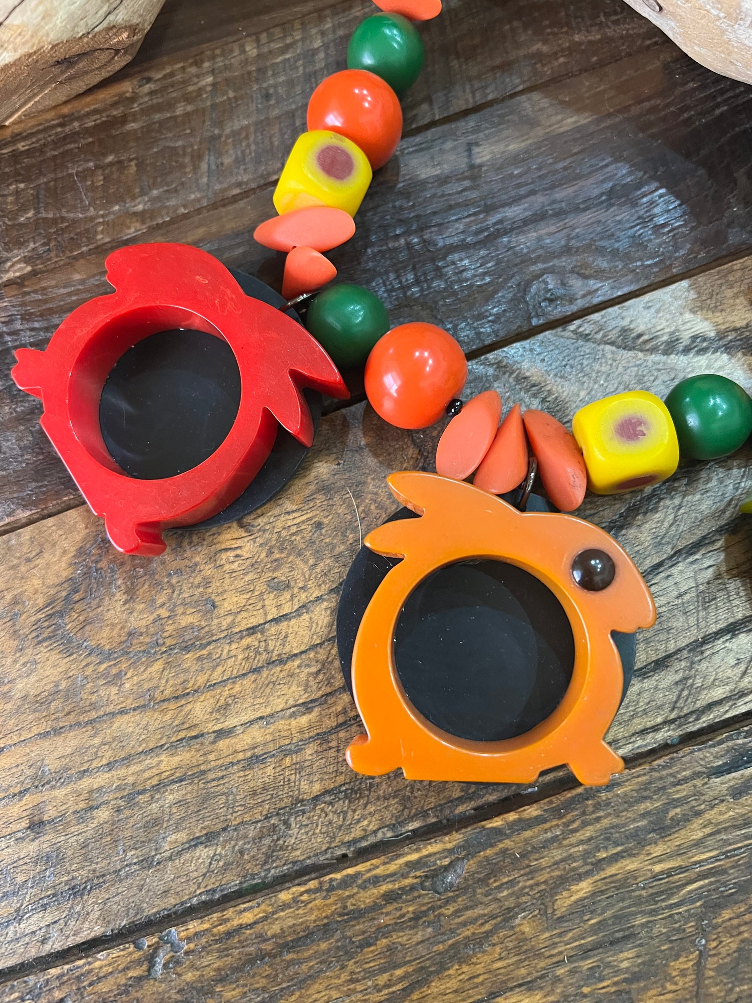 Hop into whimsy with this delightfully quirky necklace featuring adorable Bakelite bunny napkin holders as pendants. Each piece captures vintage charm with a fun, unexpected twist—transforming classic tableware into wearable art. Perfect for collectors, vintage lovers, and anyone who appreciates playful accessories that spark conversation. These one-of-a-kind pendants bring a bouncy dose of personality to any outfit.